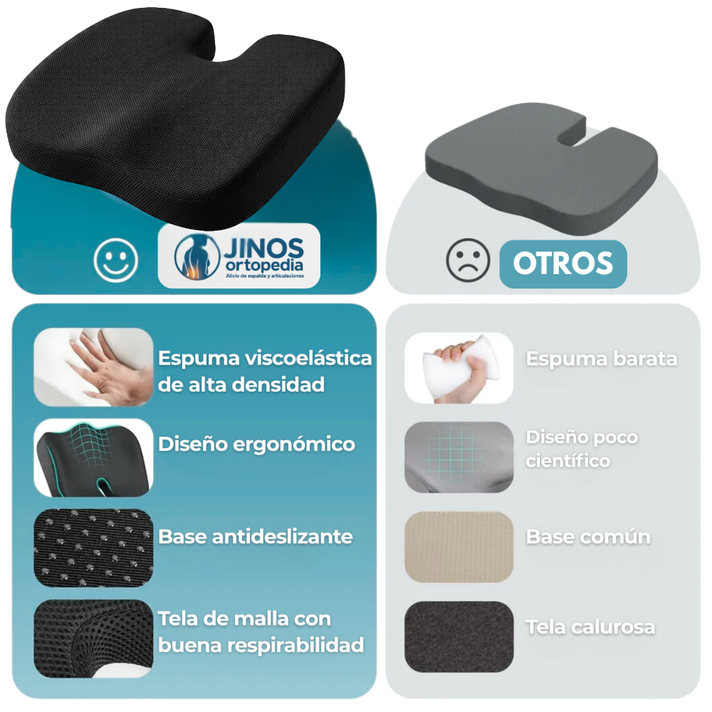Kinesiólogos y especialistas en ergonomía recomiendan Jinos por su descarga de presión en coxis, soporte memory foam denso y base antideslizante que estabiliza la postura.
